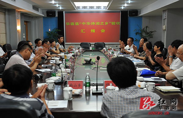 20日下午,县委副书记蒋南贵汇报了华容县“中华诗词之乡”创建工作。近年来,该县整体联动、城乡一体、重点突出、点线结合积极推进创建工作开展。全县在推进诗词 “五进”(即进机关、进校园、进社区、进企业、进农家)、不断壮大队伍、健全组织、狠抓诗词文化普及等方面,取得了显著成效,现已成立诗词分会12个、诗词小组54个,有诗联爱好者2180余人,出版诗联集14本、个人诗集74本,在服务党的中心工作,淳化社会风气,促进社会和谐等方面发挥了重要作用。