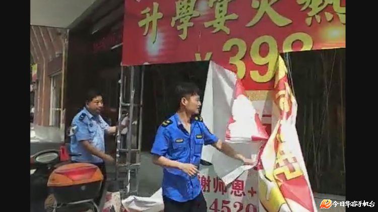 自7月9日以来,由县商务粮食局、县公安局治安大队、县城管大队等共7家单位组成的华容县宾馆酒楼“治陋”综合执法队,对县城区近30家能承办宴席的宾馆酒楼开展了为期十天的“治陋”整治工作。期间共责令自行拆除违规广告标语21处,强制拆除大型违规广告13处,拆除近20平方米的升学宴广告牌多处,并与各宾馆酒楼签订了“治陋”协议书,有效巩固了去年全县“治陋”工作成果。
