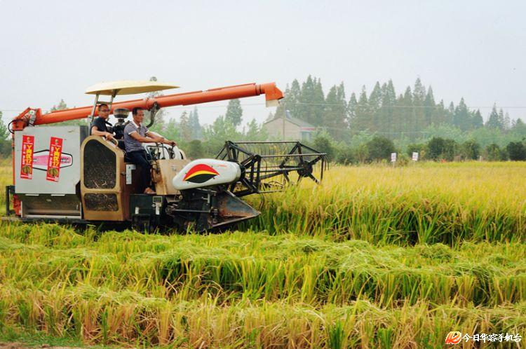 在华容县三封寺镇泰和村的一块稻田,今年的一季稻迎来丰收。一串串稻穗沉甸甸地低下了头。3台收割机依次排开,在轰隆隆的响声中,收割、脱粒、打碎秸秆、稻谷装车,一气呵成。