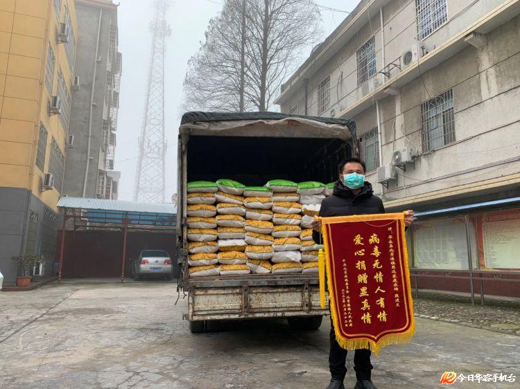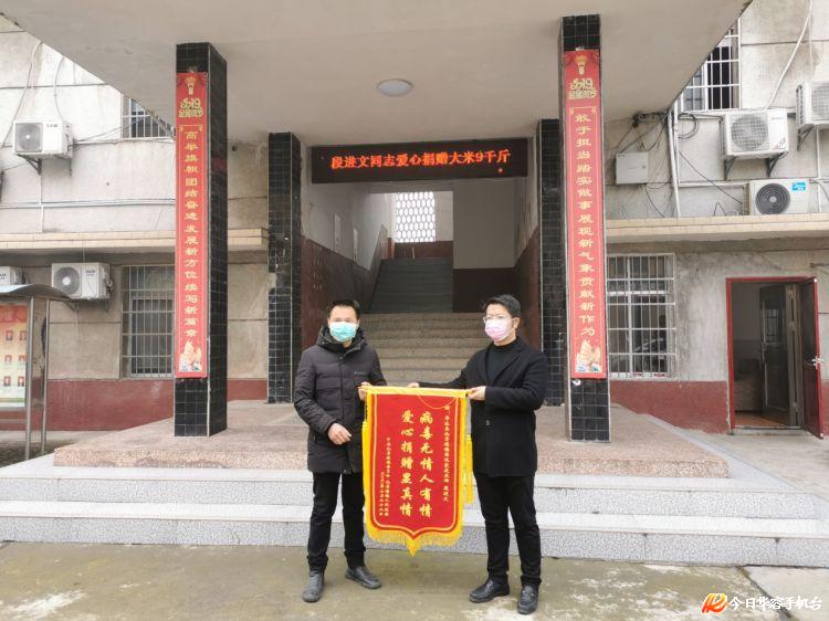 2月22日,华容县北景港镇九斤麻村思远家庭农场段进文,将新打出来的9000斤大米交到该镇党委书记万伟手中,捐赠给新冠肺炎疫情防控期间九斤麻村、小港村、建丰村等村的特困人员。