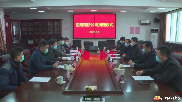 3月9日,岳阳市公路桥梁基建总公司党委委员、纪委书记任晓武代表岳阳路桥总公司员工为华容县捐赠一批防疫物资,华容县委常委、常务副县长黎朝晖出席捐赠仪式。