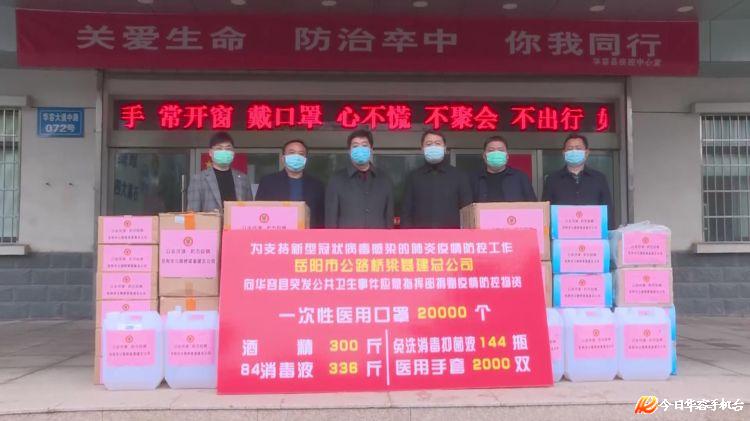 捐赠仪式上,岳阳市公路桥梁基建总公司为华容县突发公共卫生事件应急指挥部捐赠了一次性医用口罩20000个、酒精300斤、免洗消毒液144瓶、84消毒液336斤、医用手套2000双,共计价值56000元的防疫物资。