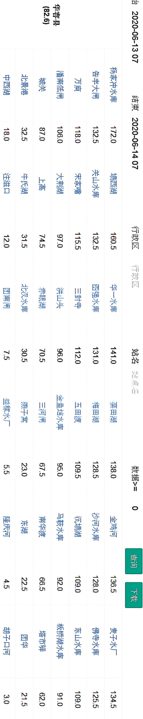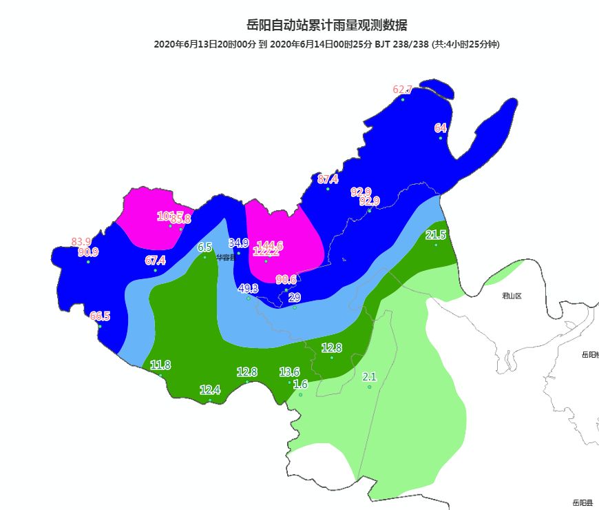 13日晚至14日8时,华容县南部北景港、禹山、插旗、注滋口、团洲5乡镇降小到中雨,其它区域暴雨到大暴雨,全县42个站点平均降雨84.4毫米,150毫米以上2个站点,100毫米以上19个站点,50毫米以上30个站点,杨家冲站173.5毫米最大,塌西湖165.5毫米次之。今年以来城关站降雨697.9毫米,比多年均值多8%;其中入汛以来降雨393.3毫米,比多年均值少3%。因连续强降雨,各电排站均全力外排,共开机42处132台25575千瓦,内湖水位都控制在汛控水位以下。今日8时,三峡水库水位146.32米,入库流量17000立米每秒,出库流量15111立米每秒;城陵矶水位27.96米,比历年同期高1.08米。我县长江塔市驿站30.36米,比昨天8时涨0.58米;藕池河梅田湖31.22米,涨0.80米;洞庭湖六门闸外28.07米,涨0.11米;华容河六门闸水位29.1米,因短时强降雨上涨1.02米。