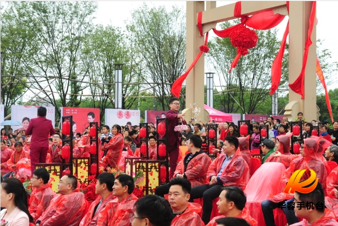 婚礼在状元湖公园湖中央的鹊桥上以情歌对唱的形式拉开序幕。新郎新娘们分别站在鹊桥两头或唱、或问、或答,款款深情,在这场秋日的细雨蒙蒙中表达出了青年男女之间浓浓的爱慕之情。