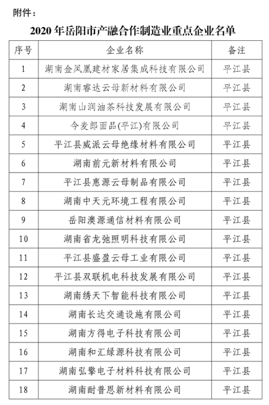 根据《关于组织申报2020年岳阳市产融合作制造业重点企业的通知》要求,经企业自愿申报,各县市区工信主管部门推荐,及合并《湖南省工业和信息化厅中国人民银行长沙中心支行关于发布<湖南省产融合作制造业重点企业名单(2020年)>的通知》(湘工信中小服务〔2020〕166号)名单,市工信局、人民银行岳阳市中心支行审核等程序,同意湖南金凤凰建材家居集成科技有限公司等187家企业为2020年岳阳市产融合作制造业重点企业,现予发布。