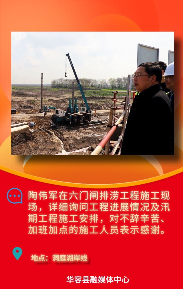↑↑↑沿着洞庭湖岸线,陶伟军又赶往六门闸排涝工程施工现场,详细询问工程进展情况及汛期工程施工安排,对不辞辛苦、加班加点的施工人员表示感谢。陶伟军强调,六门闸排涝工程是事关华容经济发展,民生福祉的重大项目。水利工程百年大计,要注重久久为功,要将质量摆在首要位置,树牢质量意识、安全意识,抓好工程施工,确保工程早日发挥效益,为华容经济社会发展和民生改善提供坚强水利保障。
