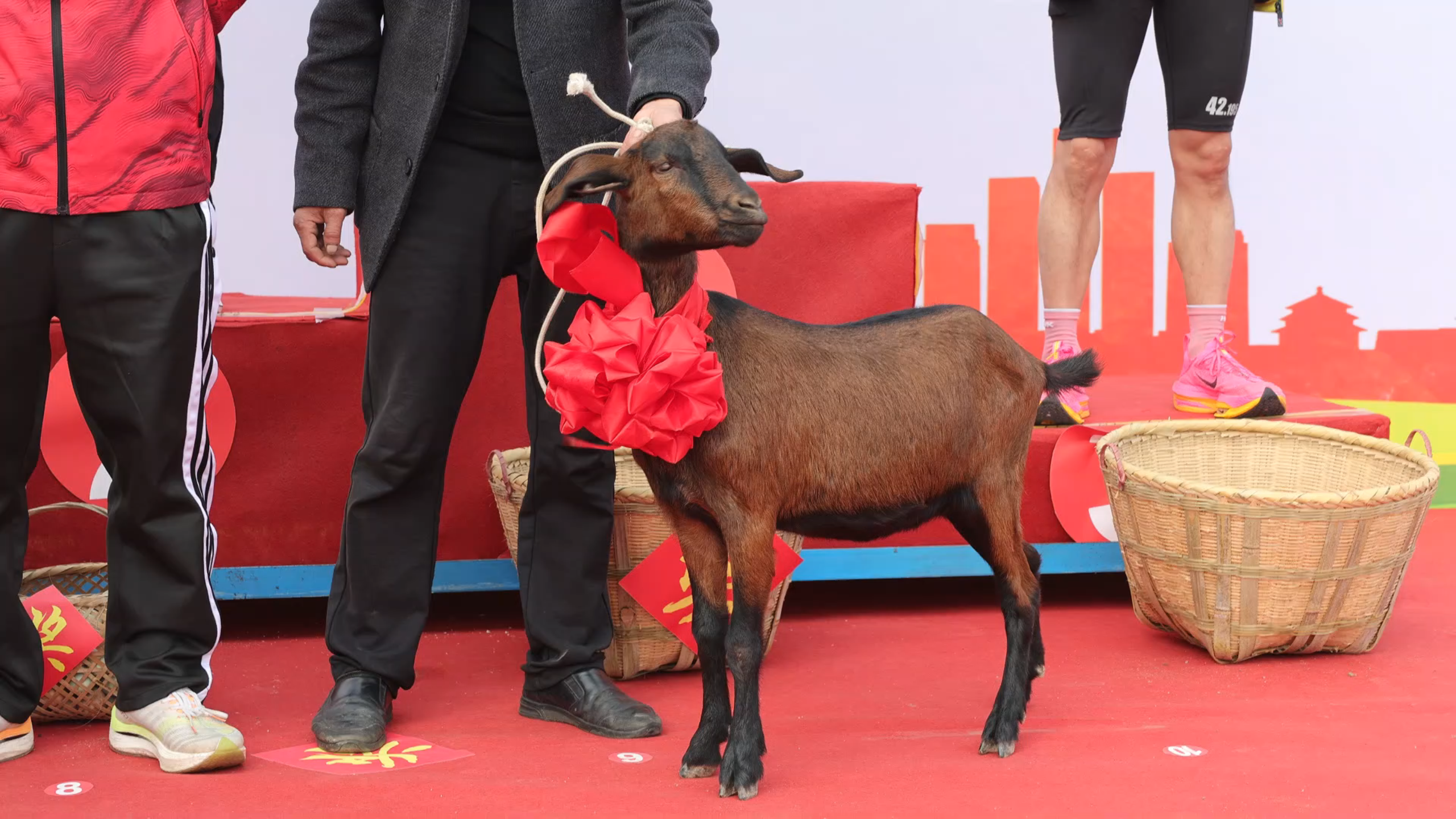 经过激烈的角逐,比赛圆满结束。主办方为选手颁发奖牌、奖品及证书。欢乐跑组的前十名选手获得行李箱、字典等奖品,半马组和10公里组前十五名选手的奖品丰富多彩,有活蹦乱跳的鸡鸭鹅、有满满一箩筐的牛肉、排骨、猪蹄、大米、蔬菜等物资,半马组冠军选手更是能把一头活山羊抱回家。主持人还通过现场抽签的形式,在各组别中抽取幸运选手,为他们送上丰厚的奖品。