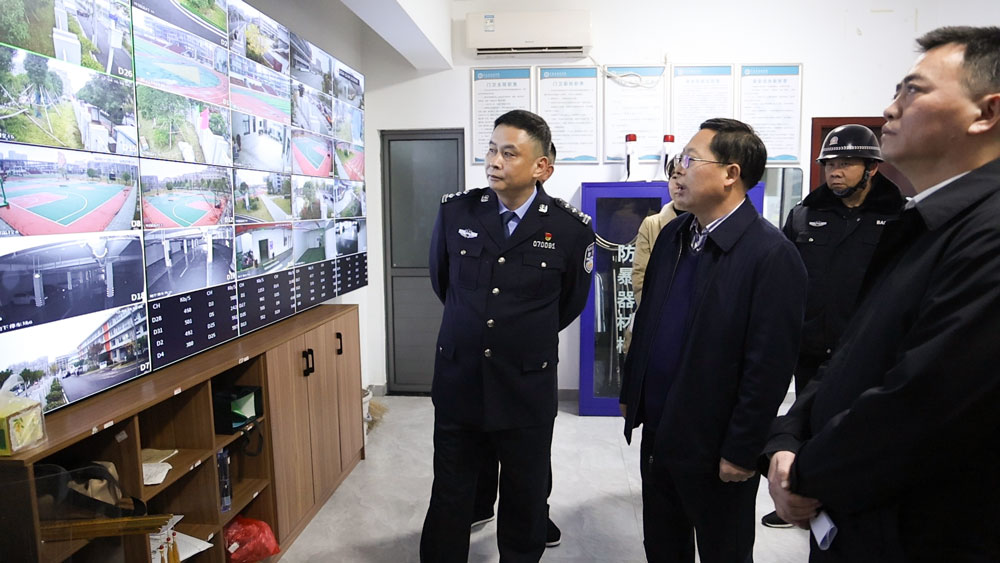 来到容城学校、章华镇卫生院等地,陶伟军一行走进门卫值班室、视频监控室察看安防设施设备,详细了解重点场所落实安全防范措施情况,陶伟军强调,要健全社会治安防控体系,整合基层警力和各方力量,进一步加强群防群治,强化对重点场所、重点部位的巡逻防控,不断提高见警率、管事率、震慑力,全力巩固和谐稳定良好局面。