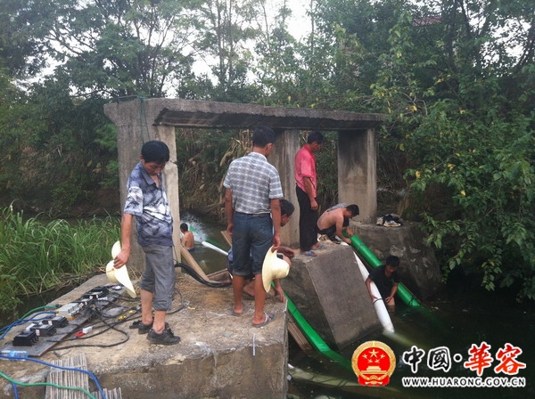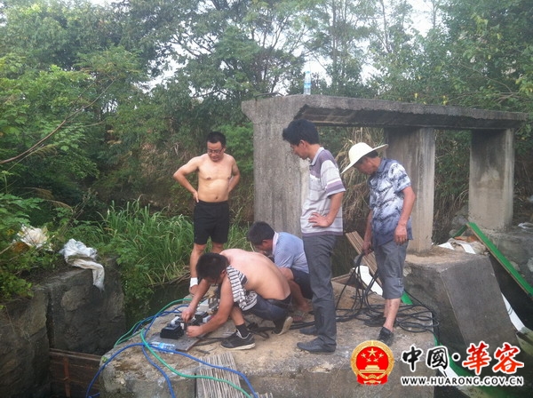 下图是乡村两级干部和水管站技术人员在烈日下抢修机埠
