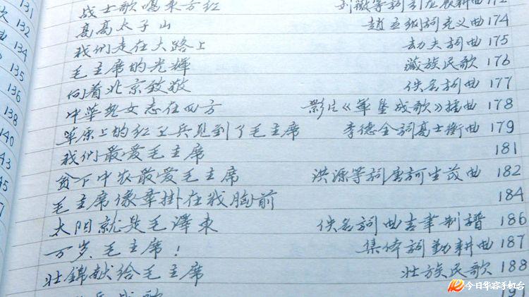 看到我们到来,王永发老人兴致勃勃地将自己抄写的“宝贝”拿了出来。翻开这本厚厚的红歌集:里面抄录的每一篇歌曲、每一个音符都工工整整,一丝不苟,没有任何的墨点。