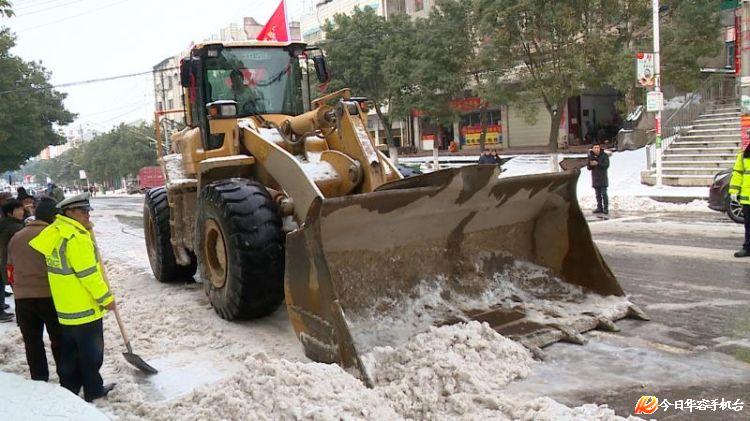 在除雪现场,华容县公安局交警大队松木桥中队的交通民警在寒风中疏导着交通,志愿者们也不惧严寒,手握铁锹干劲十足,一铲一铲地将积雪堆放到路边,一台专业除雪车、两台铲车、两台撒盐皮卡车依次作业,破冰除雪井然有序。