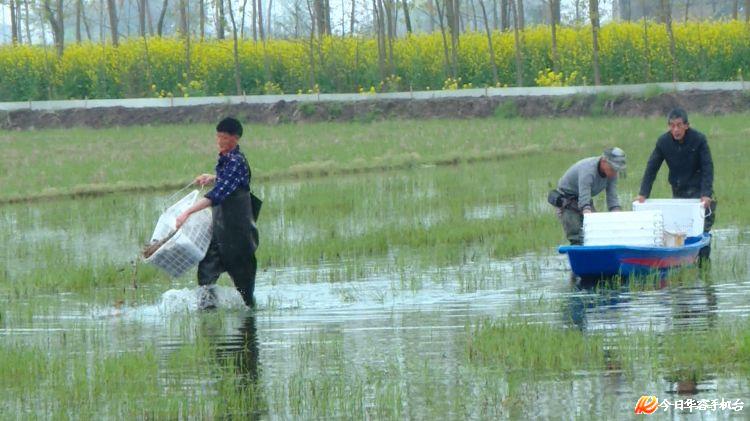 3月26日上午,华容县万庾镇万庾村一处新开挖的30亩虾田里,养殖户吴广正在进行第一次虾苗投放。经过一上午的努力,1500斤虾苗陆续投放到这片稻虾套养田内。