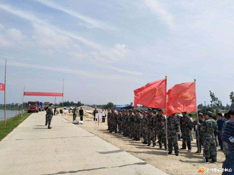 模拟实战演练中,巡逻人员在查险过程中发现景港村姬娼庙险段37+150堤脚8米处集中渗漏并伴有浑水流出。经一级级迅速上报后,镇防汛抗旱指挥所指挥长蔡勋国迅速将情况报告给县防指,并确定抢险方案:反滤导渗,蓄水反压。抢险队员30余人按照抢险方案,在工程技术指导员的指挥下,按照方法和步骤,经过40多分钟的努力,基本完成了反滤围井和砂石反滤体,模拟实战抢险演练结束。