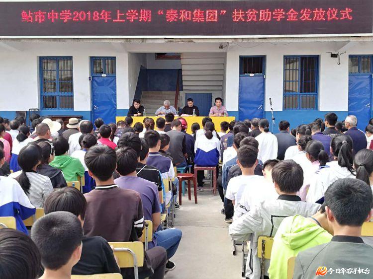 5月23日,华容县鲇鱼须鲇市中学举行2018年上学期“泰和集团”扶贫助学金发放仪式。湖南泰和集团为鲇鱼须镇鲇市中学等12所学校70名优秀学生、优秀干部、品德模范、贫困学生发放奖助学金7万元。