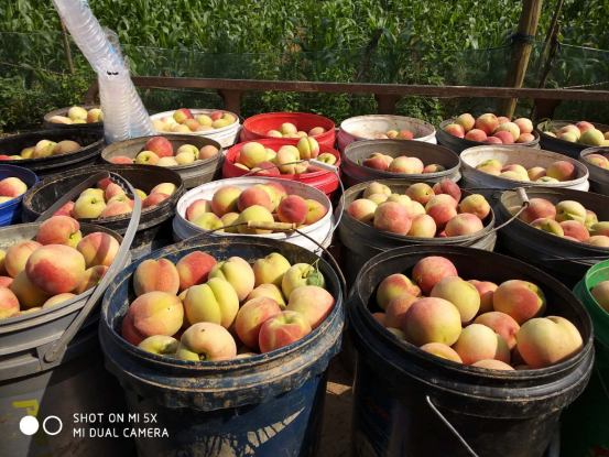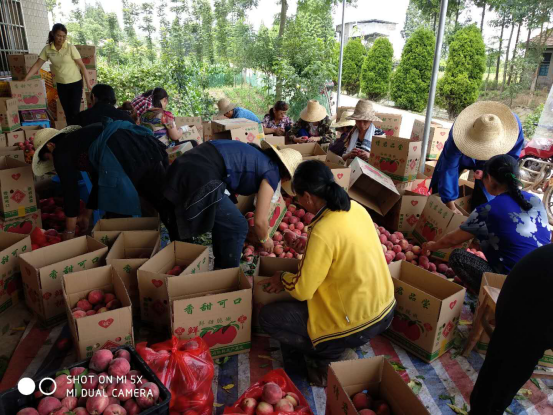 “今天是个好天气,要抓紧摘掉这批成熟的桃子,尽快销售,不然碰到下雨天损失就大了”,红桃基地老板都家立接受采访时说道。今天,30多个采摘工人顶着十分炎热的天气,在桃园里进行辛勤采摘,一方面因天气影响,必须抢抓晴好天气尽快采摘,另一方面因产品需求量较大,下午5点钟左右需要发货运输一批,必须赶在货车来之前将采摘好的桃子进行筛选、装箱,时间较为紧急。中午时分,工人们没有顾得上休息,仍在进行封箱等工作,从而保证质量优异、客户满意。