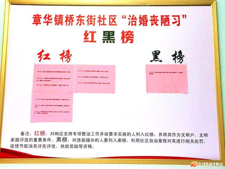 自2017年始,桥东街社区树起了一块“治陋红黑榜”,工作人员告知各位居民,“一切从简”上红榜,“违规宴请”上黑榜。红榜内的典型事迹值得学习,上了黑榜后,若不能及时改正,就会一直“黑榜有名”。