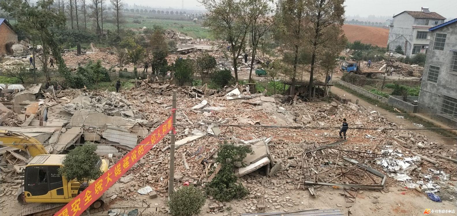 清理转移财产完成后,11月16日至11月17日,在镇指挥所的统一指导下,由专人负责,遵循同步拆除、不留隐患原则,在千和村三组拆迁现场,两天共拆除17幢房屋,圆满完成县指挥部下达的征拆任务。