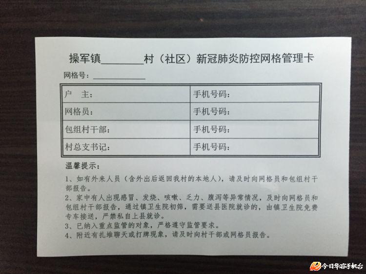贴好一张卡。操军镇有常住人口7018户29037人,根据每个网格员管理不超过20户的原则,共划分395个网格。各村选派责任心强、群众口碑好的党员骨干或村民担任网格员。全镇专门制作7500余份《操军镇新冠肺炎防控网格管理卡》,由镇村干部及网格员逐门逐户张贴到位,并做好4项温馨提示,让防控政策传达不落一人,防控网络不留死角。