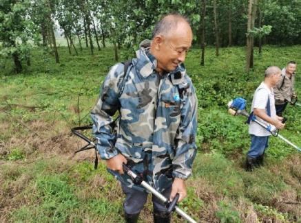 正背着打草机埋头苦干的老党员杨国兵曾是团华村团结片的一名老支部书记,在得知营连清基扫障人手不足后,便主动请缨加入到防汛队伍中来。每天早上五点,他带着一瓶八宝粥就上了大堤,一直要忙到天黑才回家。“1977年团洲围垸的时候,我就来到了这里,我在这里生活了大半辈子了,这里就是我的家。1996年溃垸、1998年防大汛,这些都是我亲身经历的。团洲防汛,从来就不是哪一个人的事情。更何况,我还是一名老党员,党旗下说过的话,那是要作数的啊。若能带动一些群众一起来自觉防汛,那更是一件好事,只要党员群众齐心协力,我相信就没有无法应付的事情。”