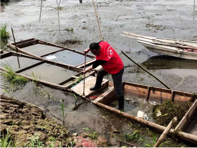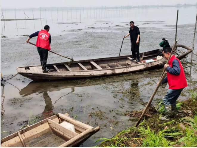 志愿者手持漏网,乘着工具船,将湖岸边的水草、水面漂浮物等打捞上岸,并进行集中处理。“牛氏湖是我们的集体资产,水草、水面漂浮物捞除干净后,湖岸清爽多了。通过劳动保护好的绿水青山,让人心情舒畅……”党员志愿者肖德龙说。这也是该村开展党史学习教育为群众办实事的生动实践。