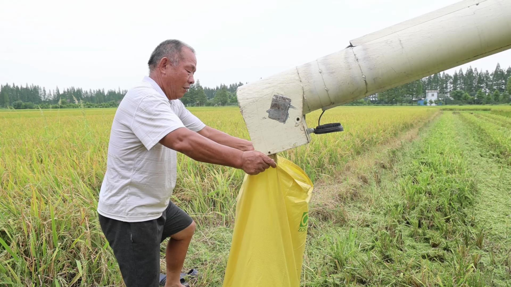 7月9日,记者在华容县万庾镇13000亩省级粮食生产万亩综合示范片看到,一片片稻田满目金黄,层层叠叠的稻穗颗粒饱满,长势喜人,几台大型水稻收割机马力全开,轰鸣声此起彼伏,在金灿灿的稻田里,来回作业。收割、脱粒、粉碎还田,稻谷“收入囊中”。农户在田梗上忙着装袋、打包,金黄的稻谷随着收割机的管道倾泻而下,一会儿便装满一袋,收割机澎湃的轰鸣声和群众的欢声笑语,交织着丰收的喜悦。
