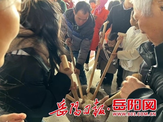 “这糍粑越打越黏越好吃,表示咱日子也越过越甜越幸福。我今天打得很用力,毕竟要锤出新年新气象嘛!”紫南村居民一边挥动着粑锤一边分享打糍粑的乐趣。