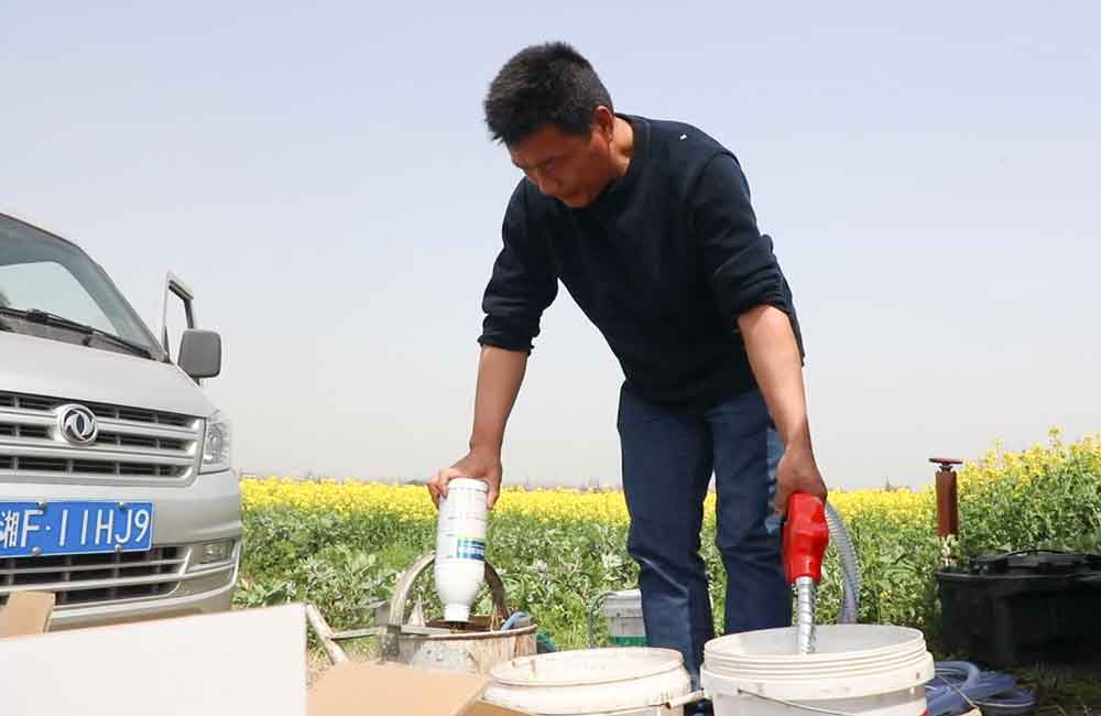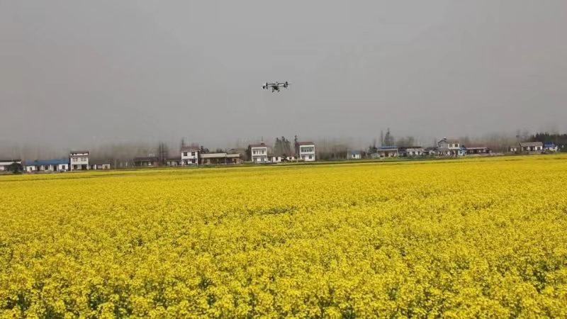 金灿灿的油菜田间,技术人员将科学调配混合好的农药注入植保无人机农药盒中,利用无人机航测技术精准生成的田间高分辨率影像,精细操作着三台植保无人机在大田里往来折返,高效作业。