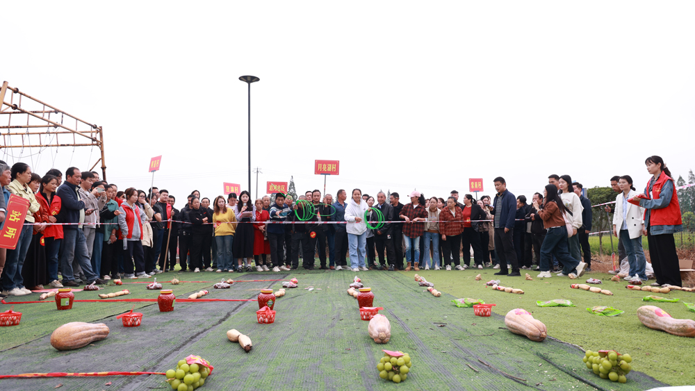 活动现场,套圈游戏率先点燃气氛,目标并非普通奖品,而是本地出产的大米、南瓜和潘家剁辣椒。规则简单而诱人:只要套中,农产品即刻就可直接带回家中。 参赛者全神贯注,观众凝神屏息,每有套中,现场便响起阵阵喝彩,这份看得见、拿得走的奖励,让丰收的喜悦变得格外真切。随后进行的收辣椒、拔河、“田间捉鸡”等环节,巧妙融入了农事元素,既考验体力与默契,也映照出农耕生活的生动场景。