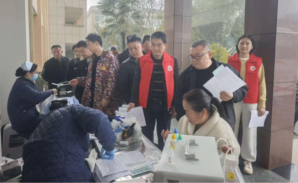 活动现场,在镇党政班子成员的带头示范下,参与人员早早有序排队等候。在工作人员和志愿者的引导下,大家依次进行信息登记、血压测量、血液初筛,现场秩序井然、氛围热烈。