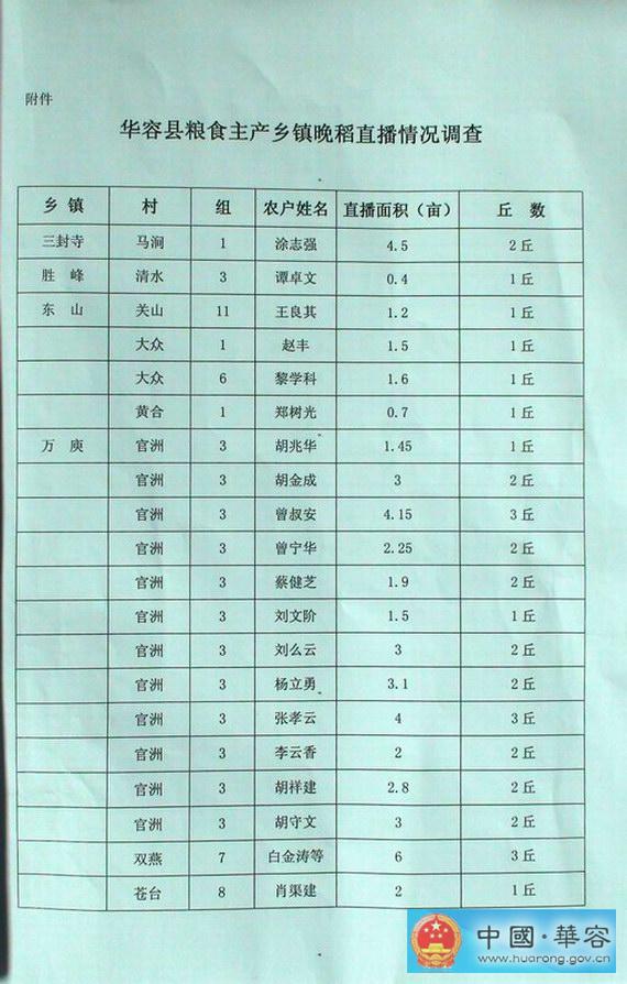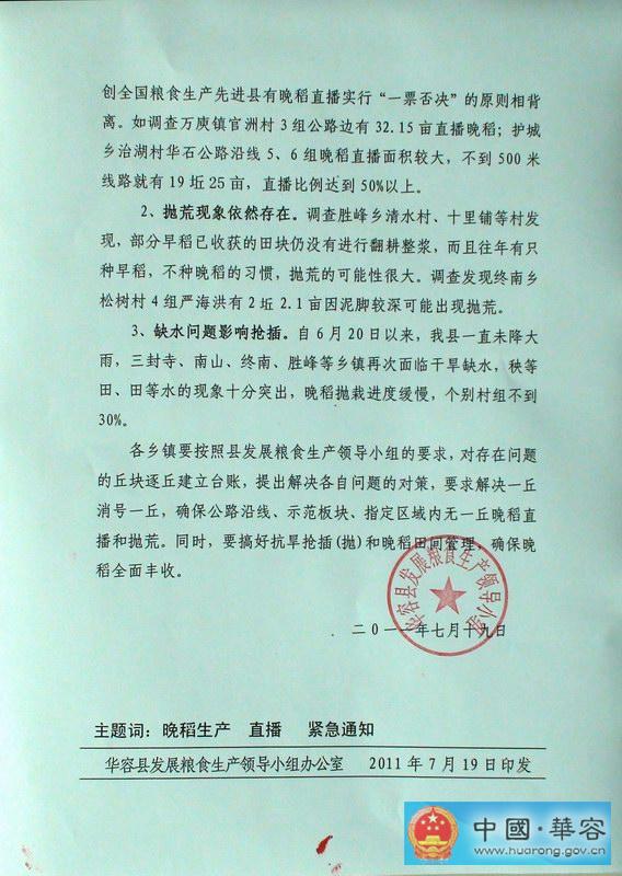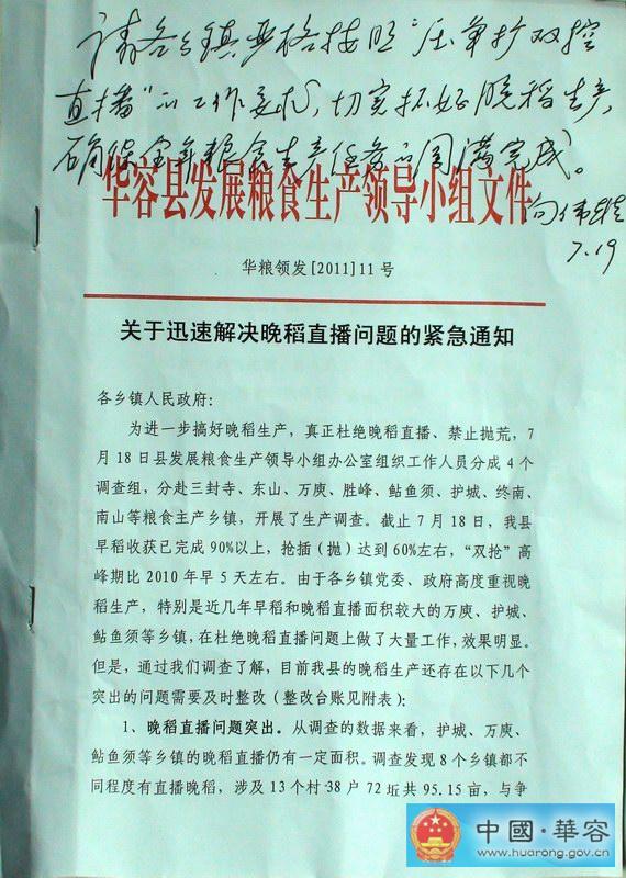 为进一步搞好晚稻生产,真正杜绝晚稻直播,7月18日华容县发展粮食生产领导小组办公室组织工作人员对粮食主产乡镇开展了生产调查。从调查的情况来看,各乡镇在杜绝晚稻直播问题上做了大量工作,效果明显。但是,8个乡镇仍不同程度有直播晚稻,涉及13个村38户72坵共95.15亩,与争创全国粮食生产先进县有晚稻直播实行“一票否决”的原则相背离。针对当前现实情况,7月19日县农业局立即向县委、县政府主要领导作了紧急汇报,岳阳市副厅级干部、华容县委书记向伟雄在听取汇报后,当场作出三点重要指示:一是坚定不移的执行粮食生产“压单扩双控直播”工作要求,不能完成任务的按“一票否决”的制度追究乡镇党委书记、乡镇长的责任;二是各级党委政府要亲力亲为,狠抓粮食生产各个关键环节,确保全年粮食生产面积明显扩大、单产明显提高、贡献率明显增加;三是各涉农部门要为圆满完成全年粮食生产的目标任务加强服务、加强督查、加强责任。并在华粮领发[2011]11号文件上亲笔批示:请各乡镇严格按照“压单扩双控直播”的工作要求,切实抓好晚稻生产,确保全年粮食生产任务的圆满完成。