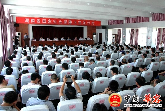 8月22日上午,在华容县东山镇镇政府礼堂内,随着岳阳市人大副主任余炳锐宣布:“湖南省国家社保卡岳阳市首发式现在开始”!东山镇三郎村居民蒋红香从岳阳市政协副主席罗陆平手中接过了属于自己的中华人民共和国国家社会保障卡,这标志着我市已经参加了新型农村和城镇居民社会养老保险的广大群众将开始陆续领取到自己的国家社会保障卡。