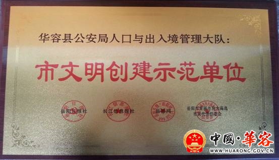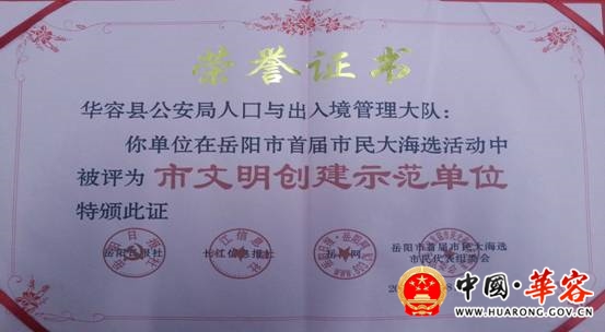 近日,县公安局人口与出入境管理大队在岳阳市首届市民大海选活动中,被群众评为“市文明创建示范单位”。