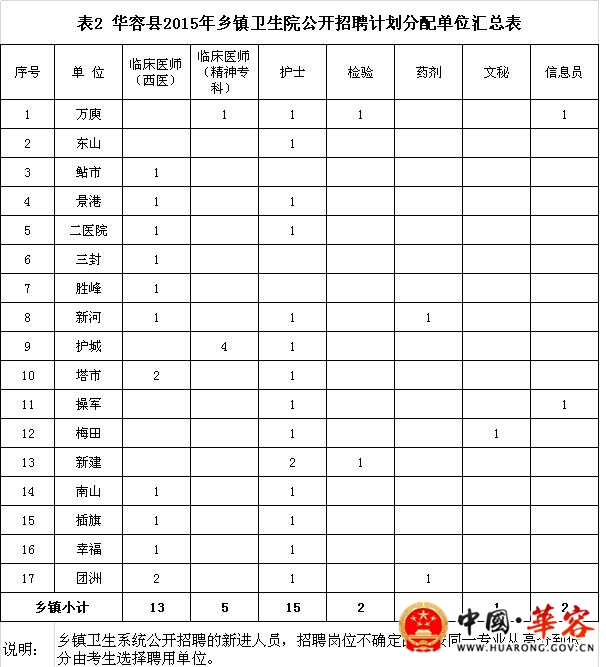 2、华容县2015年乡镇卫生院公开招聘计划分配单位汇总表