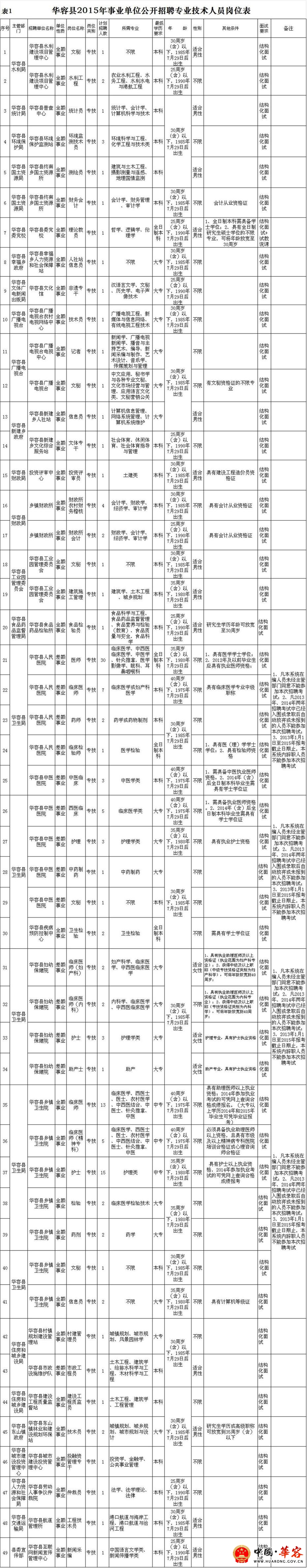 附:1、 华容县2015年事业单位公开招聘专业技术人员岗位表
