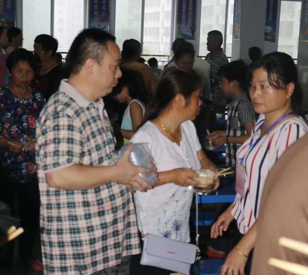“民以食为天”。受灾的群众首先担心的是吃饭问题。学校食堂在维修改进之中,临时接到这样的安置任务,后勤工作人员没有任何言难之词。他们想尽办法租赁煤炉,一日三餐准时到位。狭小的食堂操作间摆放六七个大煤炉,不言操作工序的复杂,每天40度以上的温度不是一般人能忍受的。每天看到的王斯义、白贞祥主任脖子上都是挂着一条湿漉漉的毛巾,为的是不让自己的视线被汗水模糊。“大家排好队,按秩序取碗筷,再打饭打菜。”“老人家,地面有点滑,您先坐下,我给您把饭打来。”这是范树勇副校长、肖长庚主任每天就餐时间最熟悉的声音。500余名受灾群众秩序井然,排队打饭是食堂工作人员用最真诚的服务换来的。肖长庚主任嘶哑的声音说:“只要老百姓在我们学校吃得放心、住得安心,学校工作人员累点苦点也是应该的。”