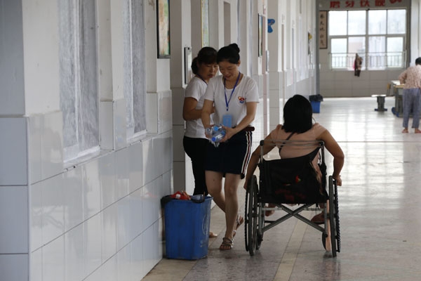 “姑儿,(方言)跟我把一体机打开一哈咯!”“姑儿,我的喉咙有点不舒服,跟我到一楼拿点感冒药来!”“伢儿,这双拖鞋有点大跟我换一双吧。”……这是几位楼层管理员每天听到乡民们最亲切的声音。她们是热心服务、不嫌麻烦的易彩霞、周俊芳、刘蓉、徐雪琴、言琴、邓琼云、江辉、李瑛、丰韵、高丽群、曹凯兰、杨福君等老师,每天负责受灾群众的日常生活管理。易彩霞、易丽枝、徐雪琴老师为行动不便的乡民洗脸、梳头发、整理内务;周俊芳、言琴、邓琼云和乡民一起聊家常,说家事,舒缓他们抑郁的心情;江辉、刘蓉、李瑛为老人端饭菜,买水果……她们的工作除了登记人口信息、分发物资、打扫卫生、晚上查寝外,还义务为老人端茶倒水,点蚊香,晾衣服、整理内务。虽然后来几天进行“三班倒”的轮班,只要学校人手不够,她们仍是分内分外齐动手,乡里乡外一家亲。患难见真情,情真看细节,日常生活中点点滴滴的小事,教师们细致周到的服务赢得了群众的交口称赞。