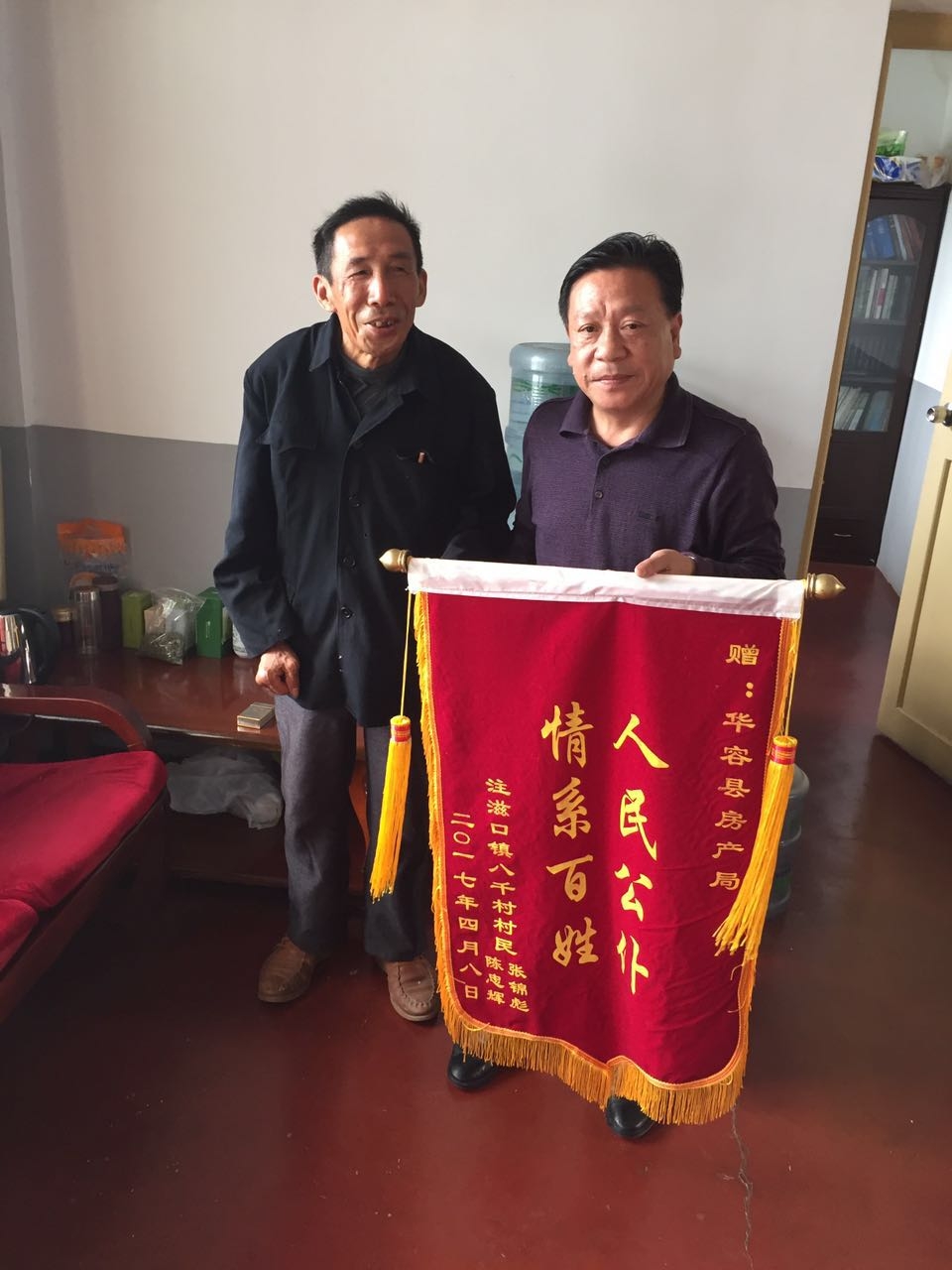 19日,注滋口镇八千村贫困户张锦彪带着印有 “人民公仆,情系百姓”的锦旗来到县房地产管理局,感谢房地产管理局帮扶工作组在精准扶贫工作中对张锦彪家庭给予的大力帮扶。