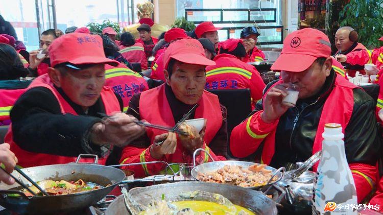 当天中午时分,负责华阳街社区、广厦社区、西街社区三个社区卫生的环卫工人们陆续来到餐馆。店内热闹非凡,身着橘色环卫服装的环卫工人成了午餐的主角,个个脸上都洋溢着幸福的笑容。