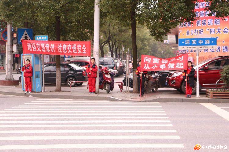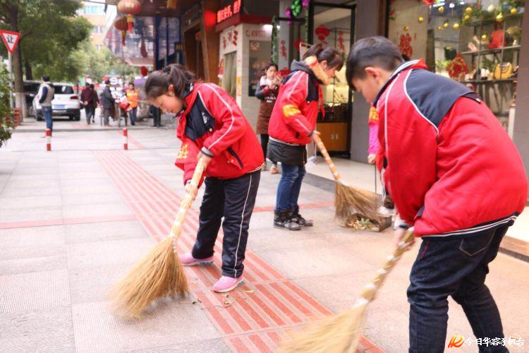 3月5日下午,华容县城迎宾中路的街道上出现了一群“红领巾环卫工”,他们臂挂袖章,手拿工具,认真地打扫街道。