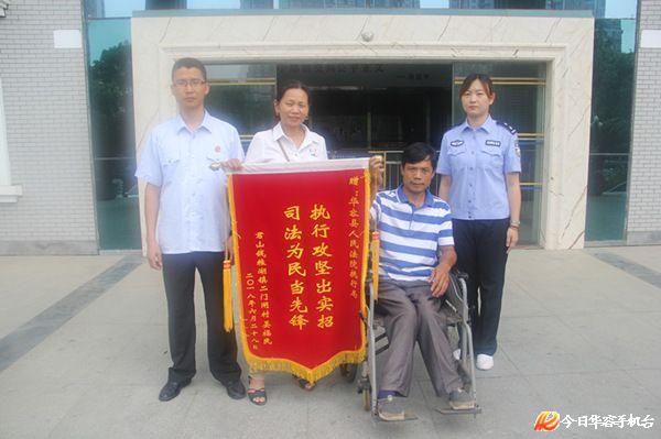 “17年了,我坐在这个轮椅上17年了,每次家人推我来法院,我们都是带着希望来,更想带着希望归。谢谢你们一直没有放弃,让我的希望得到了实现!”7月2日上午,申请执行人晏福民在家人的陪伴下,前来华容县人民法院领取了执行款11万元,并向华容县人民法院执行局送来一面锦旗,感谢法院执行干警17年来对他申请执行的案件作出的努力。这是他第二次向县人民法院赠送锦旗表达谢意。