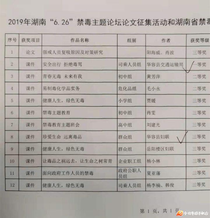 在2019年湖南省“6·26”禁毒主题论坛论文征集活动和湖南省禁毒主题课件比赛中,华容县交通运输局的《安全出行,拒绝毒驾》荣获省一等奖,华容县妇联的《珍爱生命,远离毒品》荣获省三等奖。华容县的获奖情况列全市前列。