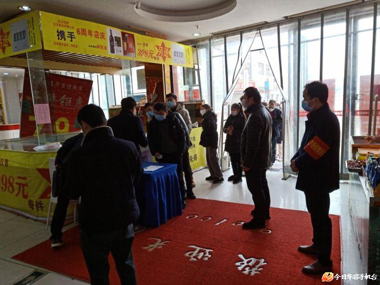 2月13日上午9时,在世纪联华超市门口,华容县市场监督管理局疫情防控人员正在维持排队秩序,“请大家按顺序排队,相互间隔1-2米,拿出身份证进行登记,检测体温,再进入超市,谢谢大家配合.......”