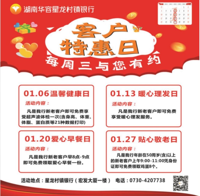 为了增进与华容市民的沟通交流,更好地提升星龙村镇银行产品和服务,该行拟在2021年全年开展“周三主题活动”。每周主题活动内容都有换新。