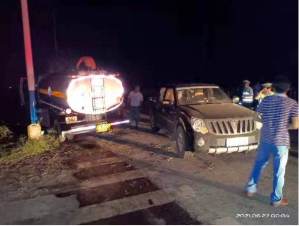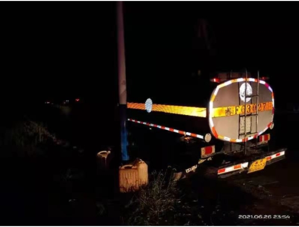 随即,杨新亭指挥民辅警开展先期处置,并向县公安局交通警察大队、东山镇政府、县应急管理局报告。接报后,相关单位火速赶赴现场进行救援。经调查得知,此中型罐式货车里装有约五吨柴油。驾驶人刘某新是华容县东山镇某村人,持C1证,当晚,其从东山天子加油站出发,欲将这车柴油送到东山火力发电站,开了不到200米,车就开始漏油,便将车开至一公里外较偏僻的地方停靠,离开现场想找人帮忙。