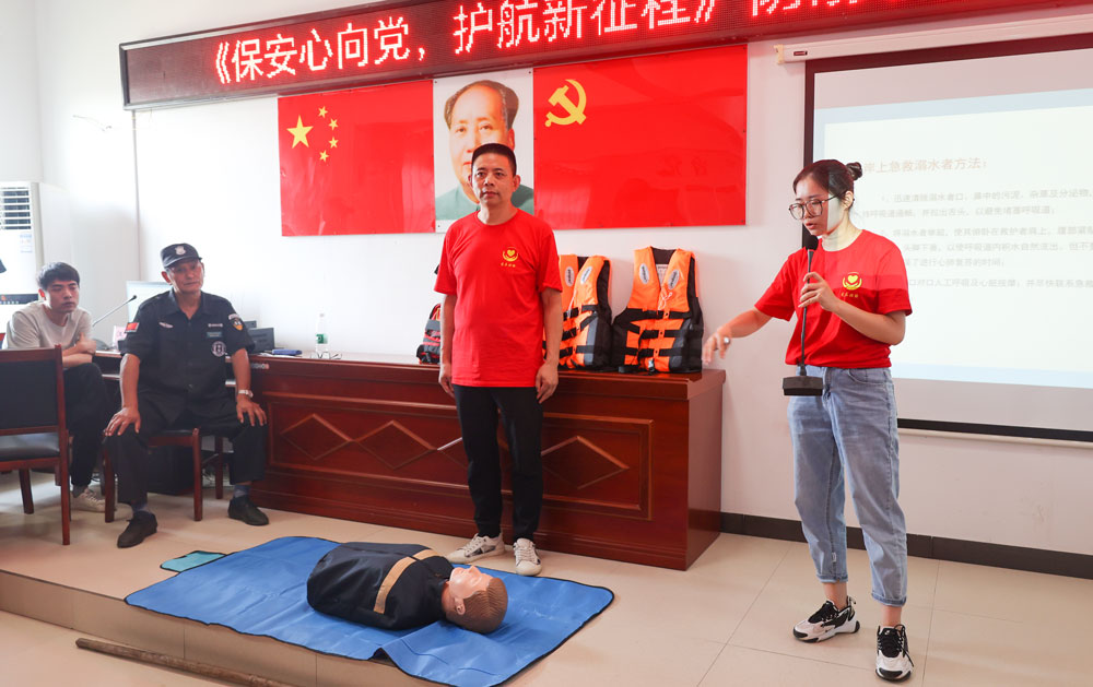 在进行溺水应急救援演练及急救心肺复苏培训环节,现场保安热情参与,认真学习急救知识,切实提高应对溺水突发事件的快速反应能力及应急处置能力,为青少年的生命安全构筑坚实的安全防线。