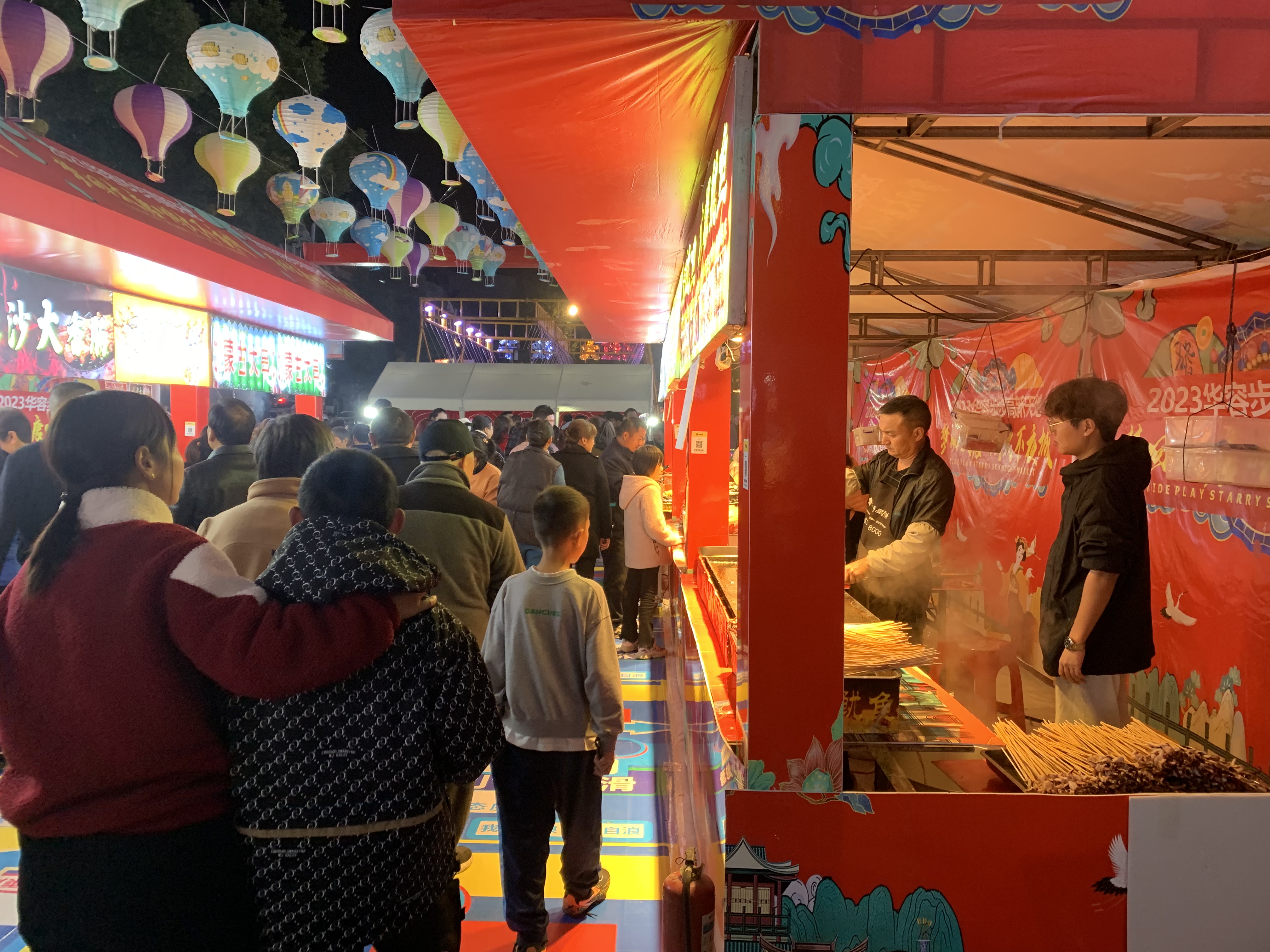 当天,活动现场明灯闪烁、人群涌动,多种不同特色的主题乐园让人流连忘返。热闹的歌舞表演,吸引市民驻足拍照欣赏。滴着诱人糖汁的冰糖葫芦是孩子们的最爱;现场制作的手工鱼丸冒着腾腾热气;阿里山烤肉串、章鱼小丸子、网红拉丝热狗等特色小吃与华容本土美食相得益彰。