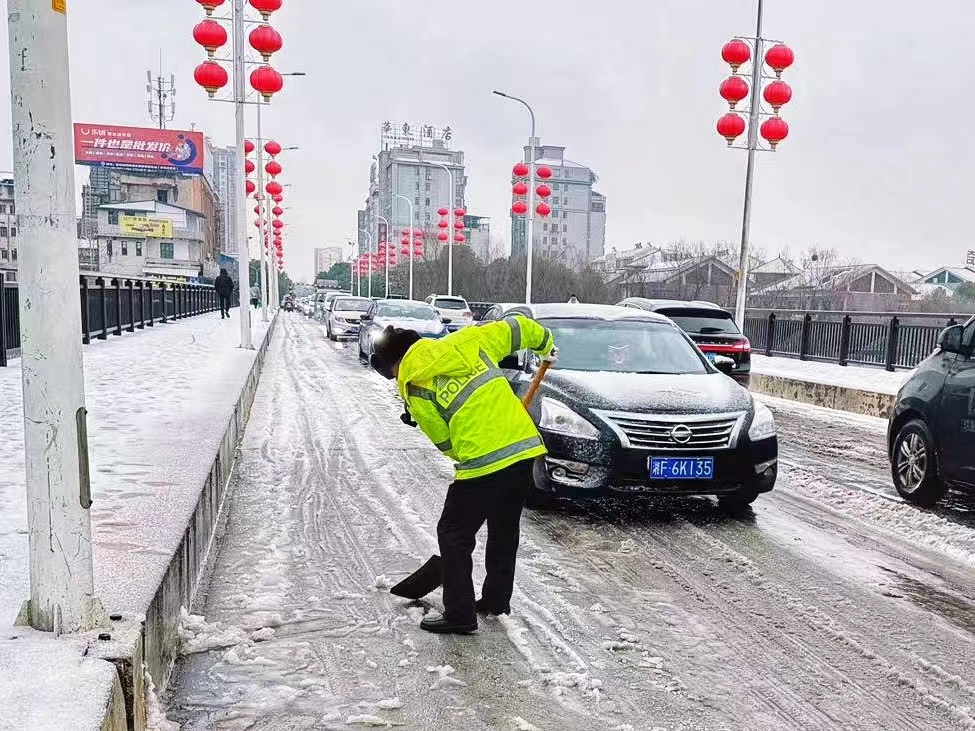 县公安局交警大队组织交警在梅田湖大桥结冰路面撒盐、在县一大桥结冰路面除冰