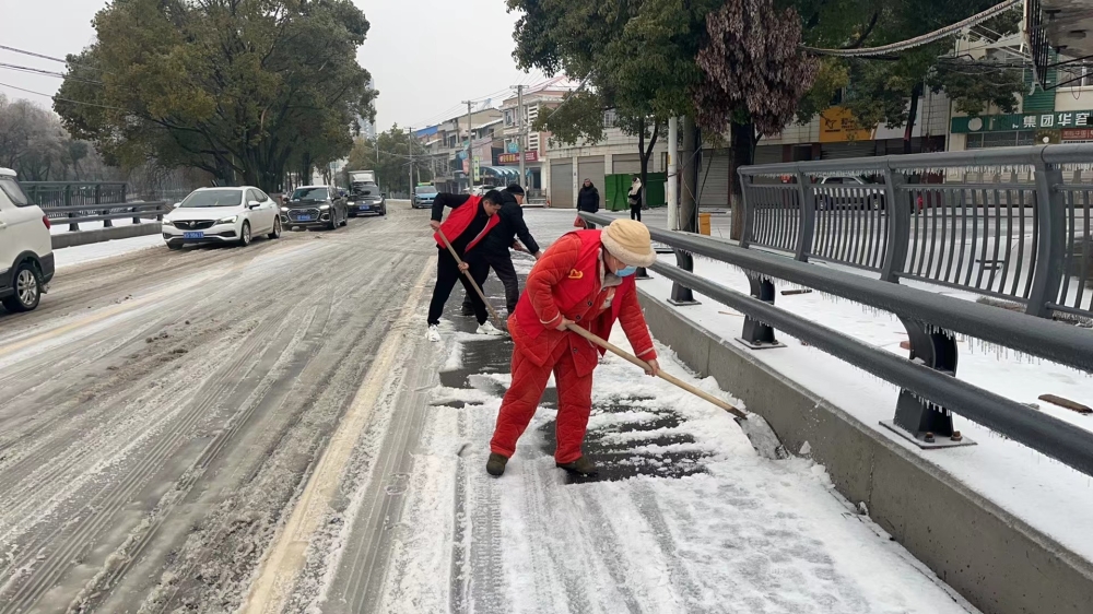 章华镇治湖社区在益丰桥路段、迎丰桥路段进行铲雪除冰行动华容县城市管理和综合执法局在迎宾桥铲雪