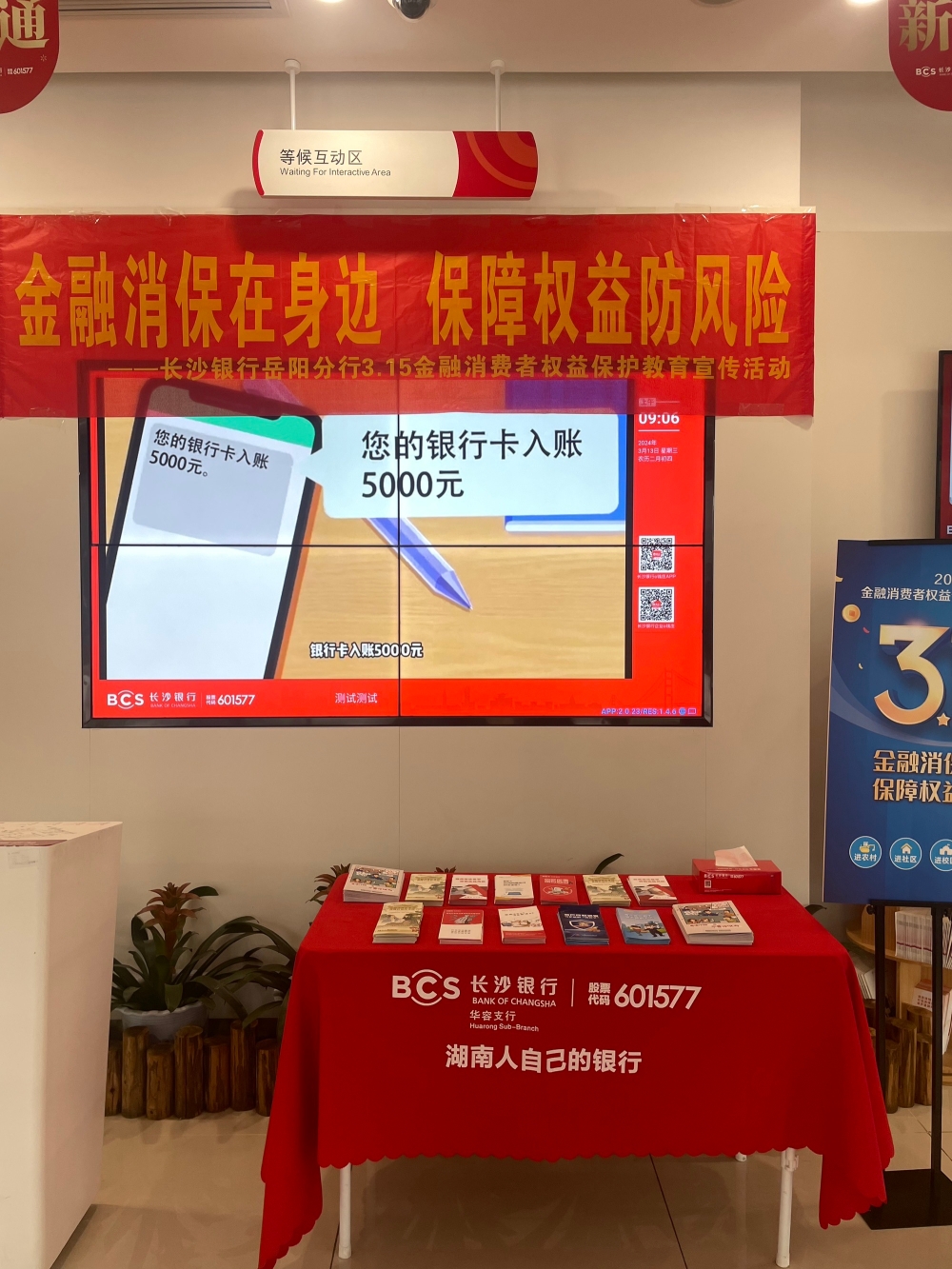 华容融媒体中心讯(通讯员 蔡坤)长沙银行华容支行作为地区性金融机构,始终坚持将“服务”放在最前面,致力于为广大消费者提供安全、便捷、高效的金融服务。连日来,长沙银行华容支行策划了以“金融消保在身边 保障权益防风险”为主题的消费者权益保护周宣传活动,旨在普及金融知识,增强消费者的风险防范意识,进一步巩固和加强与消费者之间的信任关系。
