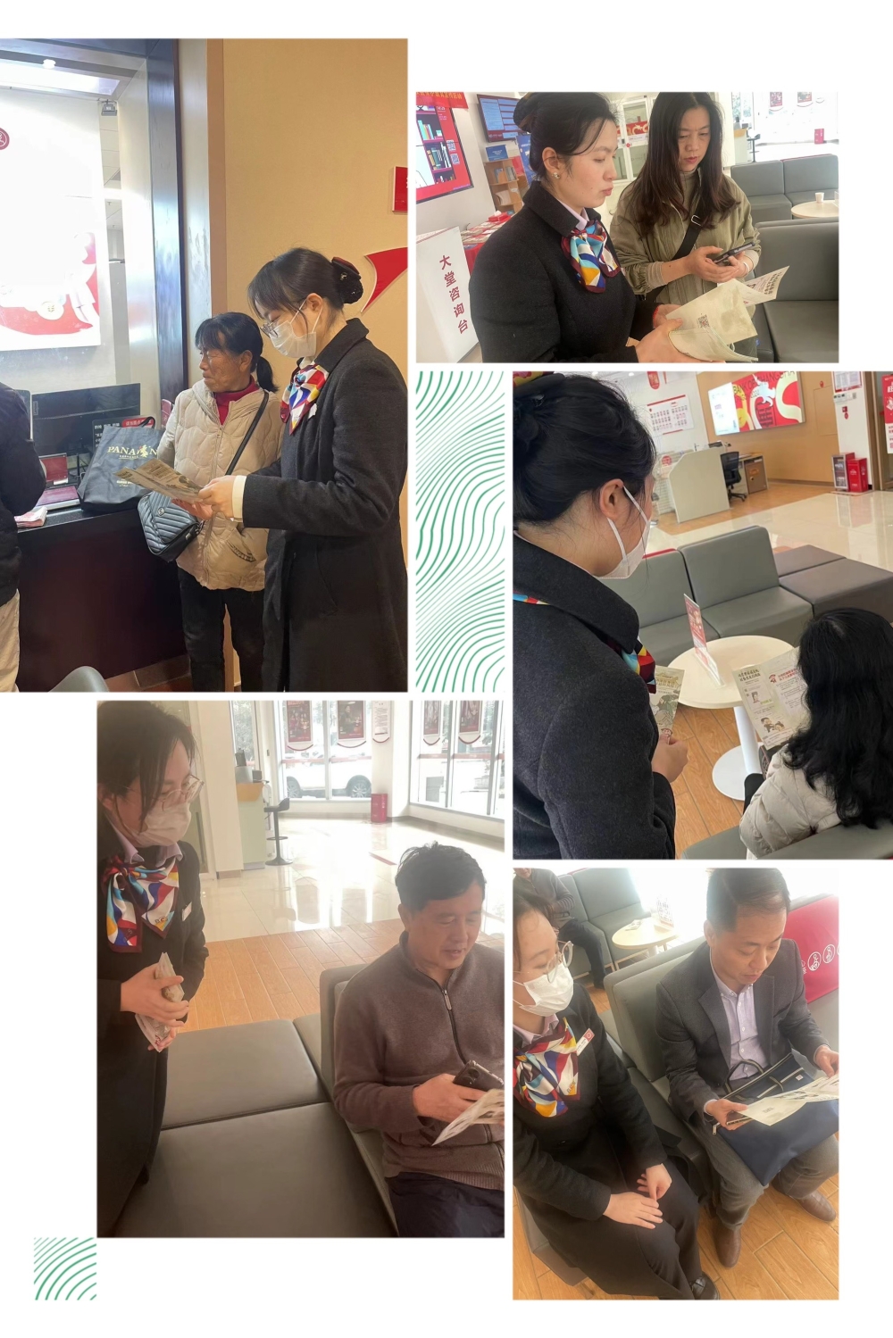 工作人员对到网点办理业务的客户提供一对一宣传服务,普及银行卡使用常识、防假人民币和防范电信诈骗等知识。同时帮助消费者了解各类金融产品的正确办理渠道及相关风险,帮助其提升法律意法制意识制意识,更好地保护自身合法权益。
